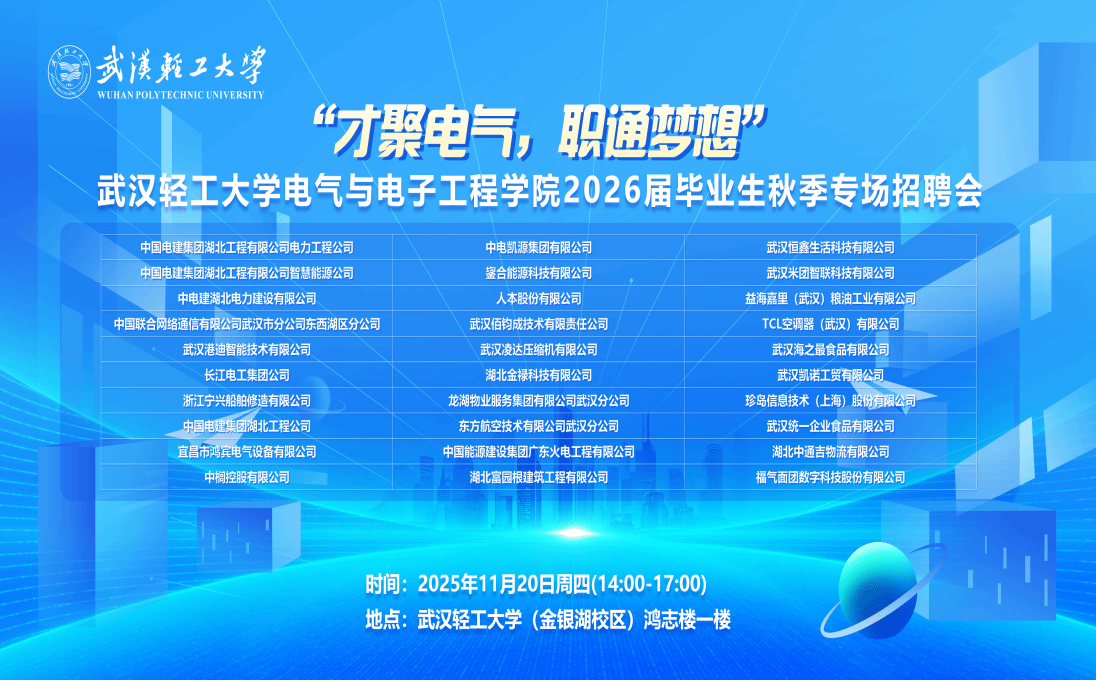 11月20日下午,武汉轻工大学电气与电子工程学院“才聚电气,职通梦想”2026届毕业生秋季专场招聘会在鸿志楼一楼顺利举办。本次招聘会汇聚了中国电建、中国能源建设集团、益海嘉里、TCL等30余家优质企业,覆盖电力设备研发、智能制造运维、电气系统设计、新能源技术应用等热门领域,面向毕业生推出技术研发、工程技术、项目管理、生产运维等多元化适配岗位。