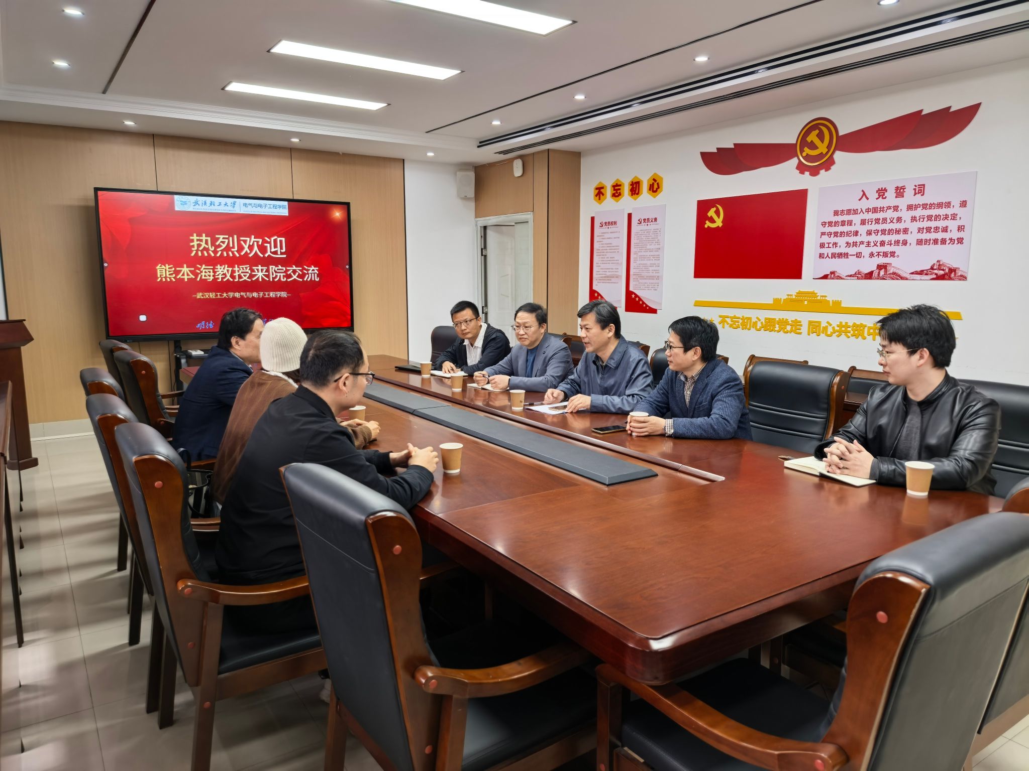 张聪院长对熊本海教授一行的到来表示热烈欢迎,并围绕学校“大食品、大营养、大健康”三位一体发展方略,详细介绍了学院在智能装备研发、自动化控制、电子信息处理等领域的研究基础、科研成果及学科优势。他重点阐述了电气学科与学校畜牧、食品等特色优势学科交叉融合的发展思路,以及学院在服务国家粮食安全、助力乡村振兴战略中的实践探索与成效。同时,张聪院长还介绍了学院依托学校卓越工程师学院,在工程型、复合型人才培养方面的布局规划与建设进展。随后,院长助理黄臻副教授及魏巍、周明宽、李腾等青年教师分别汇报了各自的研究方向、在研项目进展及技术积累,重点围绕智能检测技术、机电一体化装备、嵌入式系统开发、自动化控制等与畜牧装备智能化密切相关的研究内容进行了详细阐述。陈洪波副院长就学校研究生培养体系构建、学科交叉型人才培养模式创新等内容,与熊本海教授展开深入沟通,为进一步完善学校“大食品、大营养、大健康”交叉学科人才培养体系提供了思路。